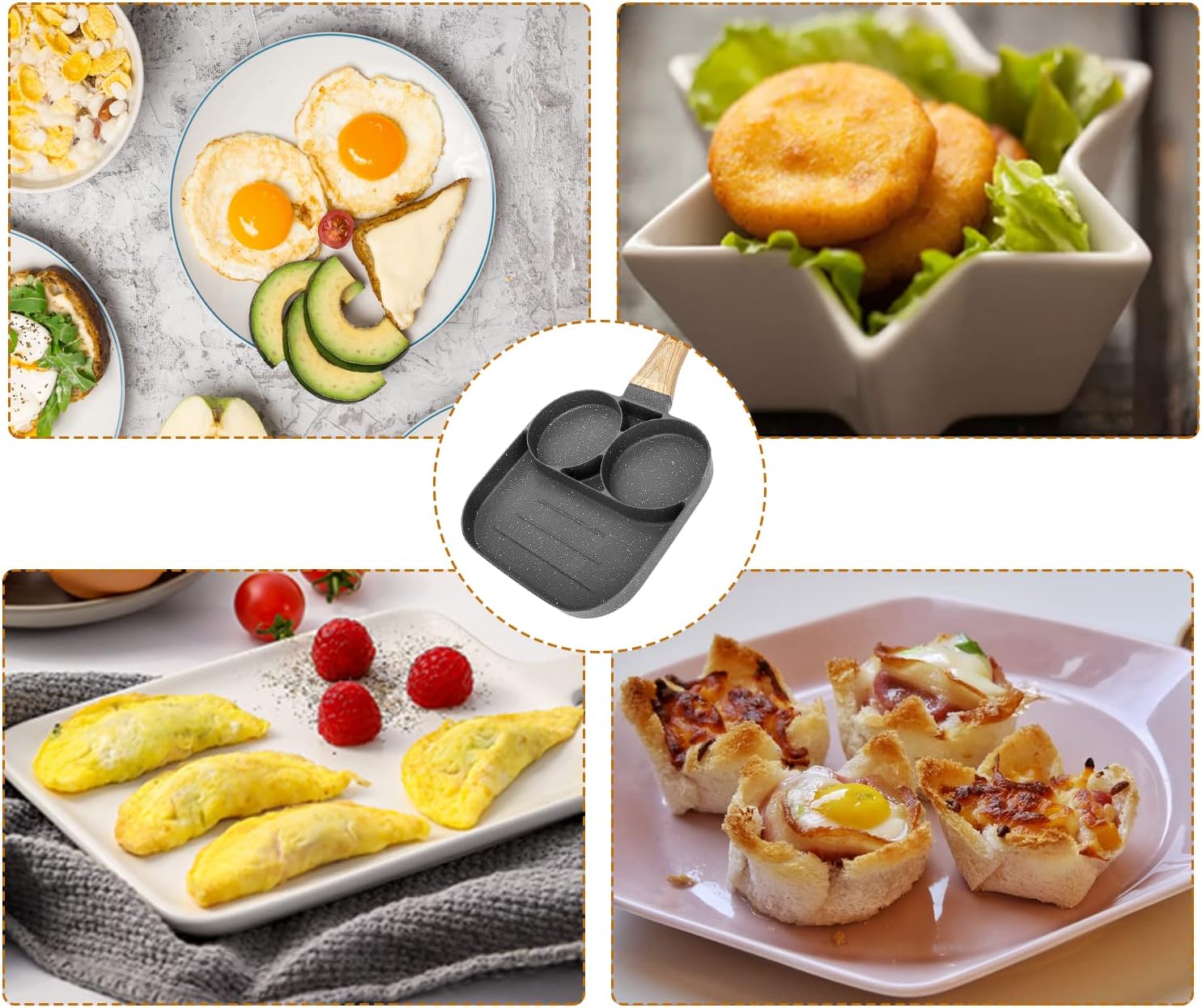 A MEJOR CALIDAD, AL MEJOR PRECIO!! . ventas al mayor y al detal.--------------------------------------------------------------------------------------------------------------------Sarten Ceramica Antiadherente 3 En 1La sartén de 3 secciones divididas te permite cocinar 3 alimentos diferentes simultáneamente. La sartén todo en uno evita tener que utilizar varias sartenes. Los compartimentos son lo suficientemente separados para evitar que los alimentos se mezclen, lo que te ayuda a ahorrar tiempo y energía para cocinar un desayuno y un almuerzo elaborado en una sola sartén para ti y tu familia con poca limpieza. Y gracias a sus ventajas únicas esta sartén para tortillas es ligera y fácil de transportar, y se puede utilizar tanto con cocinas de gas como eléctrica. El mango de madera no solo es bonito, sino que también se mantiene fresco en la estufa. Caracterìsticas: • Esta sartén está hecha de material resistente, la bandeja para huevos es resistente en estructura, lo que hace que sea mucho más duradera en comparación con otros productos similares. La parte inferior de los utensilios de cocina de hierro fundido está hecha de acero inoxidable que distribuye el calor uniformemente. Será tan bueno como nuevo, incluso se ha utilizado durante mucho tiempo.• El revestimiento interno de piedra es libre de PFOA y PFOS, no daña la salud por lo que puedes disfrutar de alimentos saludables cocinados por ella. El cuerpo de este sarten de tortilla incluye 2 capas conductoras de calor, un revestimiento resistente al óxido y a la abrasión para mayor durabilidad, revestimiento interior de 3 capas que proporciona un rendimiento antiadherente superior. Revestimiento antiadherente que hace que los alimentos no se peguen a la sartén y sea fácil de limpiar. Limpia la sartén con esponjas suaves, pero no utilices material abrasivo para lavarla.